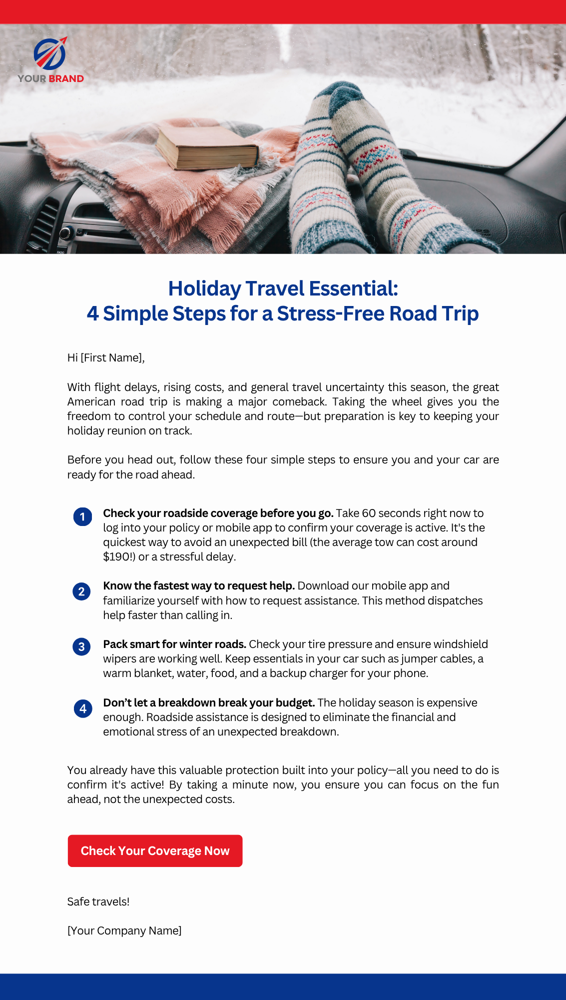 Don't let your holiday road trip get detoured by a roadside event. Learn more about how your roadside coverage benefits can keep your travel plans on track with no stress (or cost).